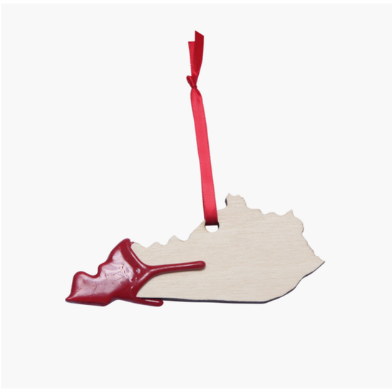 A wood cut Kentucky ornament with red wax dripping Includes red ribbon