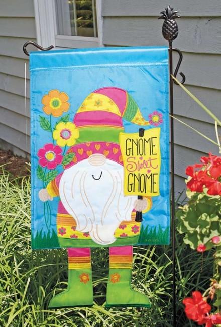 Double sided applique flags are double thickness, readable on both sides. They are heavier than most flags on the market and will hold up longer. They have detailed stitching and a combination of appliqueed fabric and embroidery stitch. Leg dangles add extra fun to the whimsical characters on these seasonal garden flags! Dangles are about 6" long and are added to the length of the flag. 13 inches by 24 inches Height.