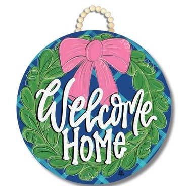 Our Welcome Home Bow Large Hanger is a UV Printed Door hanger measuring 23" round that is perfect for indoor or outdoor use. All original designs are printed on a moisture resistant high quality 1/4" board and sealed for additional protection with 2 coats of a gloss finish. DK hangers come with a fully wired beaded handle.