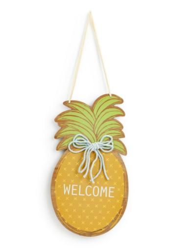Welcome guests in style with the Welcome Pineapple Door Hanger! This yellow, wooden door hanger is the perfect summer decoration. A fun and useful gift for the one who loves to dress up their entryway.