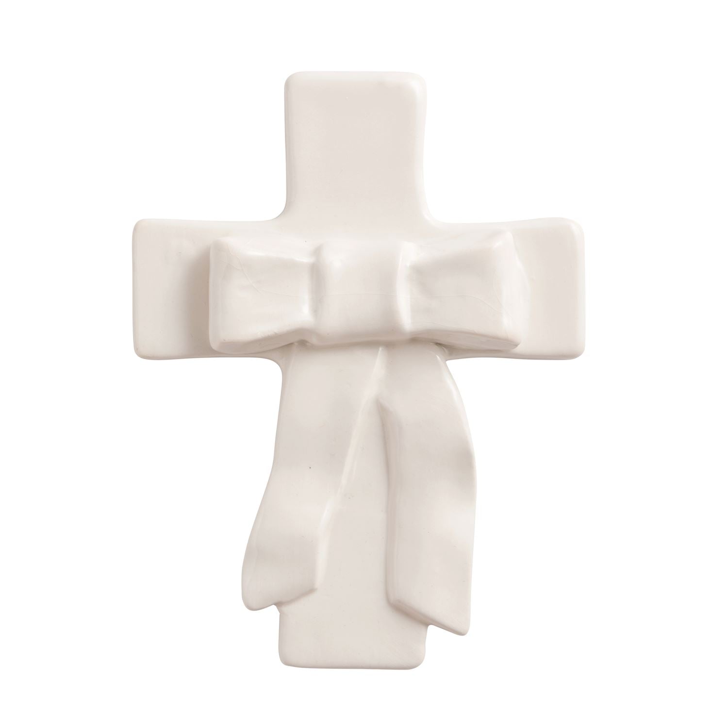 Ceramic cross features layered dimensional bow.