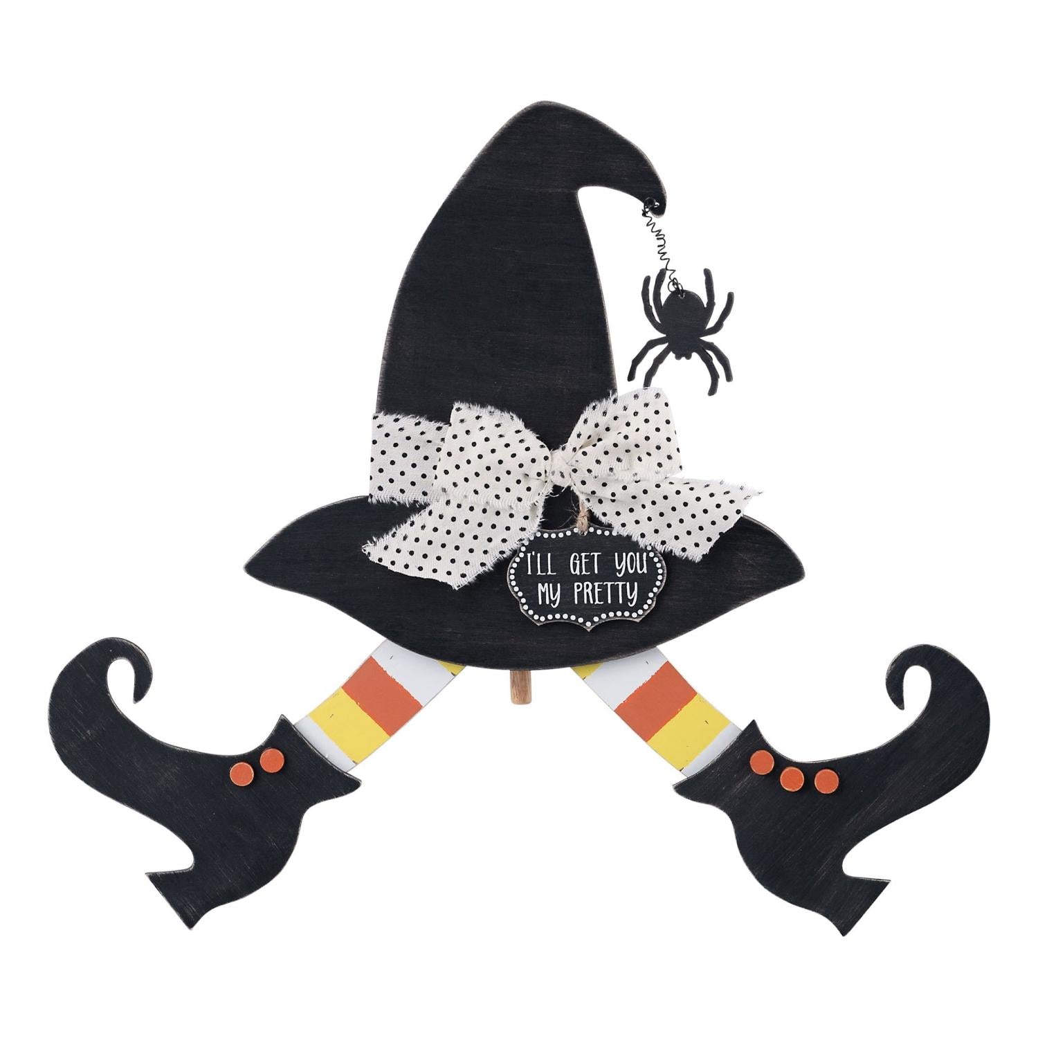 Decorate your home this fall with our adorable witches' hat topper! The design features a witch hat with a dangling spider on top of witch legs. A spooky way to spice up your home décor this Halloween!